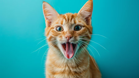Close-Up Portrait Surprised Tabby Cat Yawning with Mouth Wide Open, Isolated on Teal Background