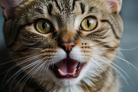 Portrait of a tabby cat with open mouth on gray background