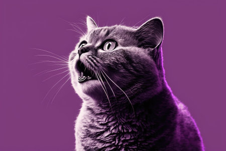 A British cat in purple staring upward. The cat grinned madly as he opened his lips. the idea of an animal being shocked or impressed. The silhouette of a cat on a coral colored, blank backdrop. Generative AI