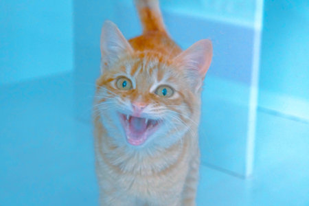 Close-up of cute ginger cat with wide open mouth, wide photo