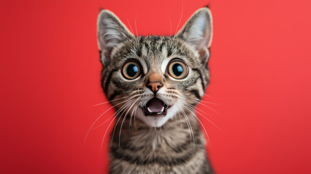 A joyful tabby kitten with wide eyes and an open mouth appears startled against a vivid red backdrop. Its playful expression captures the essence of feline curiosity and charm.