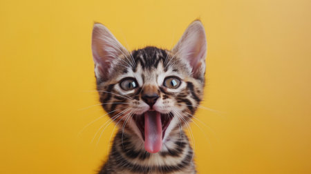 A mischievous and hungry Bengal kitten eating and licking its lips with tongue. Isolated on a soft yellow pastel background.