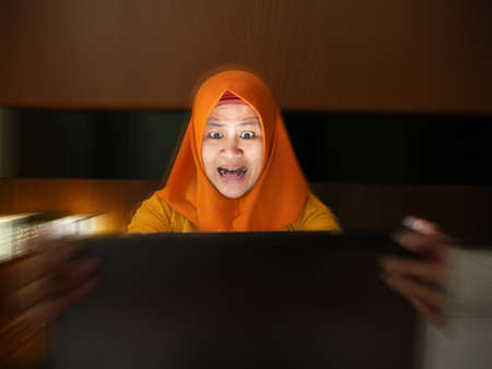 Portrait of muslim businesswoman wearing hijab shocked stunned when looking at laptop, bad negative news concept