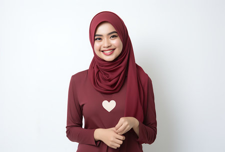 Portrait of beautiful asian muslim woman wearing hijab with heart shape on white background