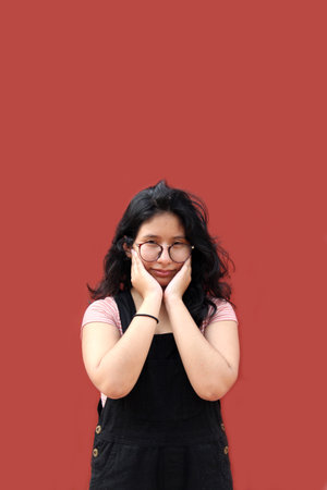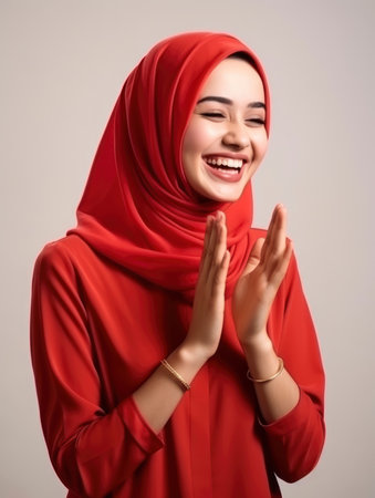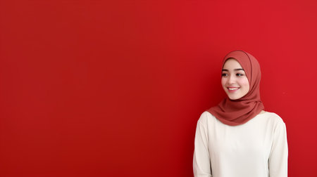 AI Generated. A beautiful Indonesian model smiles softly, wearing a vibrant red hijab