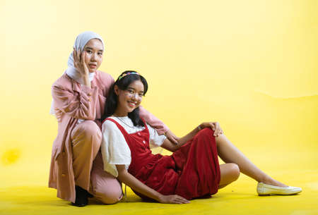 Portrait of happy Asian muslim teenage girl smiling and waving at camera, wearing red hijab against yellow background