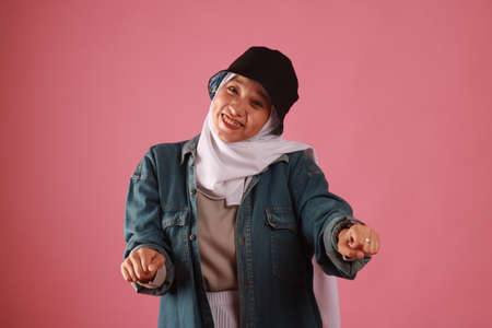 Fashion portrait of young beautiful asian muslim woman with wearing hijab isolated on pink background.