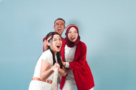 Three people cheerful Indonesian wearing flag headband are pulling on a rope, joining competition for Indonesian Independence Day. fun game