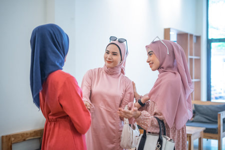 Arab Muslim women drinking coffee in the morning outdoor, Asian businesswoman young girl smiling hand hold coffee cup standing closeup.