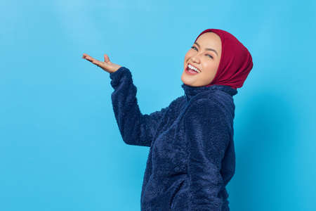 Portrait of cheerful young Asian woman showing copy space on palm isolated over blue background