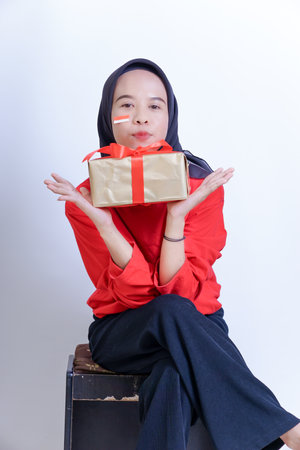 A young Indonesian woman wearing a hijab holds a gift with a red ribbon and a painted flag on her cheek, isolated on white background
