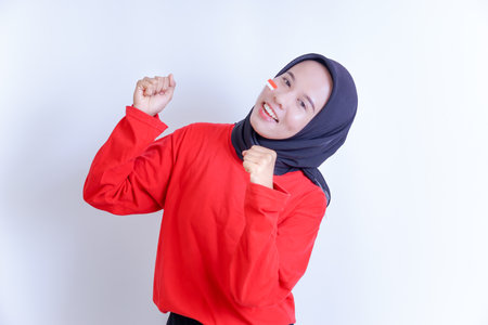 A young Indonesian woman wearing a hijab is smiling happily, wearing a red T-shirt and has a small flag sticker on her cheek, signifying a celebration or national pride.