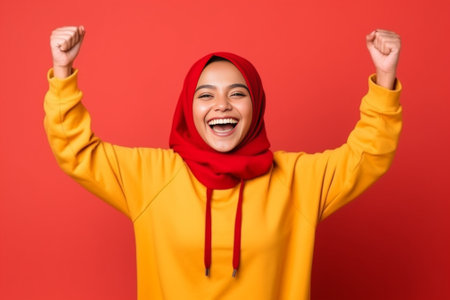 Portrait of success beautiful muslim businesswoman wearing hijab screaming shouting and shows winning victory gesture over red background