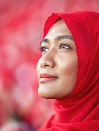 Radiant Young Woman in Red Hijab with Dreamy Expression
