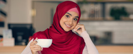 Woman in Red Hijab Enjoys Coffee in a Cozy Cafe Setting While Smiling Warmly