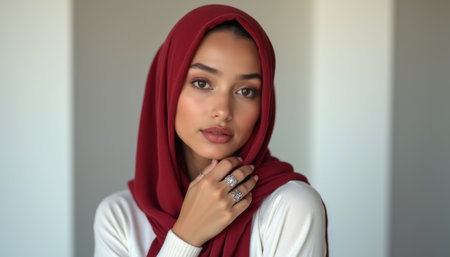 Elegant woman in a red hijab with stunning rings