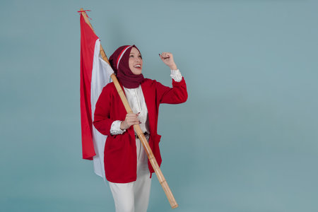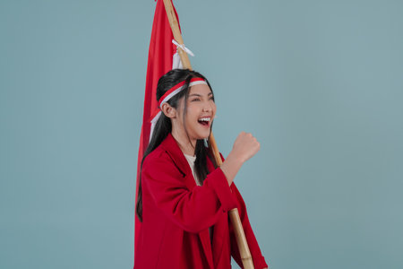 Indonesian woman wearing a red jacket holding a flag while raising fist gesture with excited expression. Indonesian Independence Day concept.