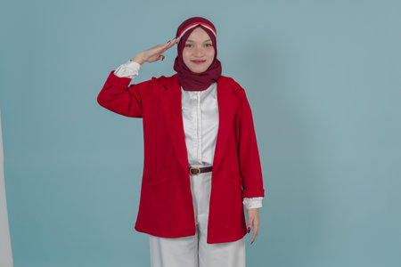 Smiling young Indonesian woman in a red jacket and hijab is doing salute gesture to the camera. Indonesia Independence Day concept.