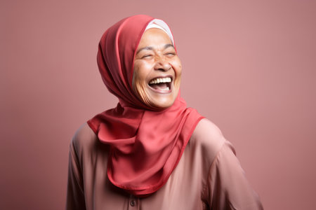 A joyful Indonesian woman in a headscarf smiles warmly.