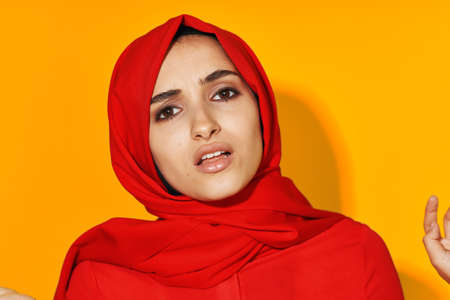 arab woman attractive eyes fun gesture hands yellow background
