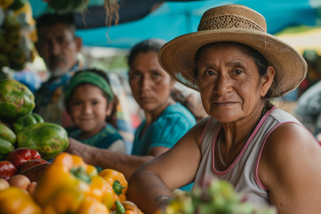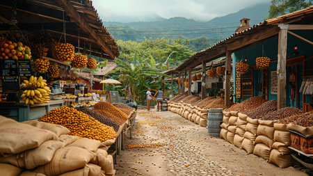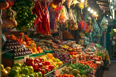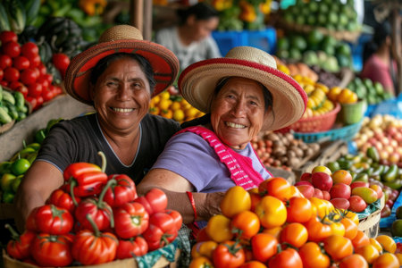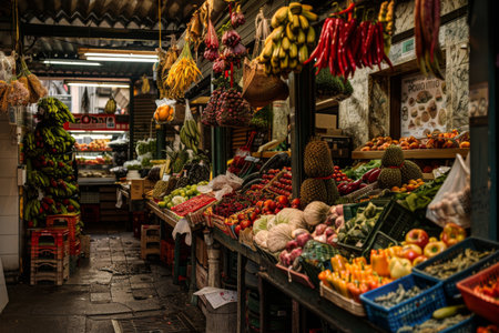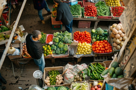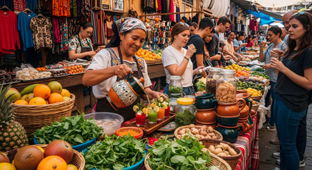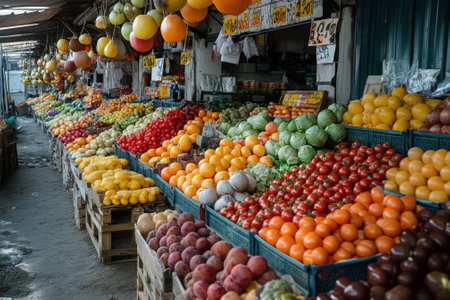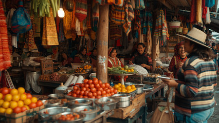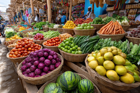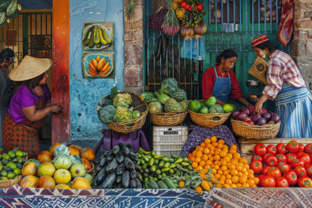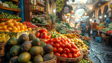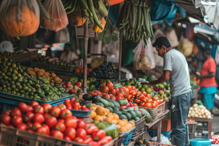 Vibrant market scene community and commerce flourish with fresh produce and active shoppers