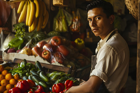 Fresh organic produce variety sold by market vendor in city street generated by artificial intelligence