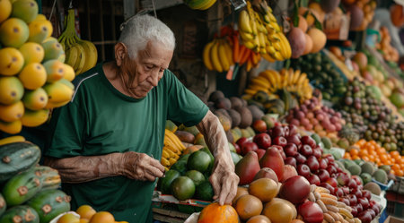 Elderly Vendor Arranging Fresh Tropical Fruits at Vibrant Outdoor Market Stall in Southeast Asia