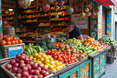 Fresh, colorful produce sold by street market vendors in Asia generated by artificial intelligence