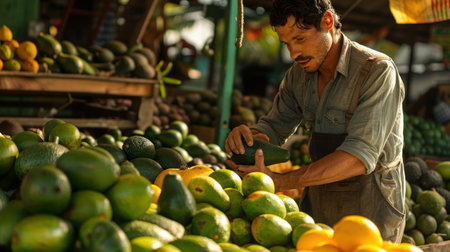 Market vendor arranging fresh vegetables and fruits in colorful crates at local market in the afternoon