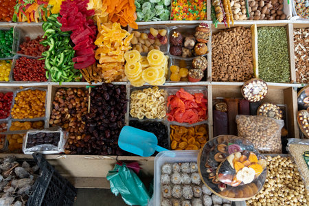 Closeup of assorted dried exotic fruits in local traditional market on display