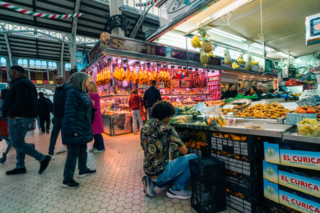 Valencia, Spain 04 07 2025 Interior of Mercado Central in Valencia bustling with people shopping for fresh produce. High quality photo