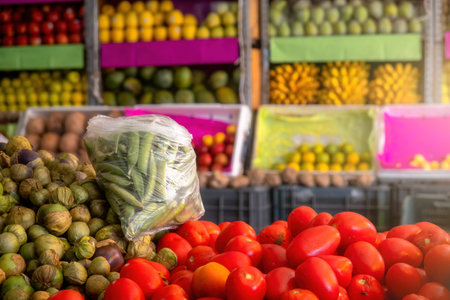 Colorful fresh produce stall in lively market with exotic fruits and vegetables. That the image is generated using AI.