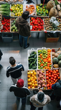 A diverse group of individuals gathered around a table abundantly filled with various fresh fruits and vegetables, A bustling outdoor market from a bird's eye perspective, AI Generated