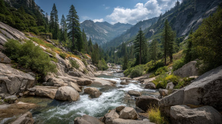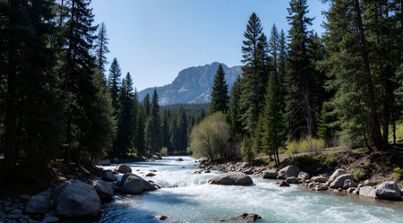 Serene landscape featuring flowing river surrounded by lush greenery and towering mountains. scene captures beauty of nature, with clear blue skies and vibrant trees reflecting tranquility