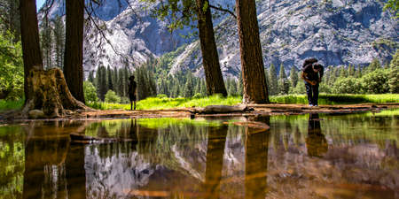 Two men by the reflective creek in Yosemite valley