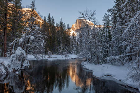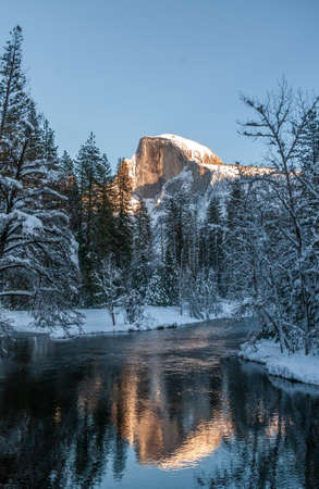 The peak of half dome is baking in the full light of the setting sun. It is reflected in the merced river, on a bright snowy winter afternoon during golden hour.