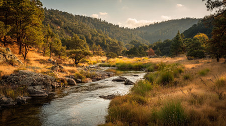 Serene Mountain Stream Flowing Through Golden Grassy Meadow Landscape