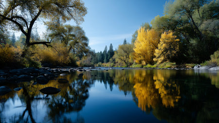 Beautiful autumn scenery with colorful trees reflected in calm river water