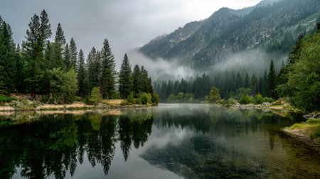 Calm waters mirror the serene landscape as early fog blankets the mountains and trees.