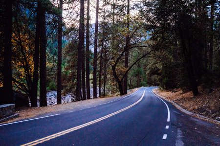 Empty Road with double yellow lines in the forest in Mountains in Fall in California national park