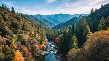 A breathtaking view of a serene river winding through an autumn forest, framed by majestic mountains and a bright blue sky filled with wispy clouds.