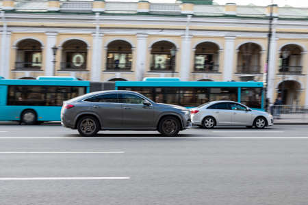 Bangkok - August 2018: Mercedes-Benz white cars fast runing on the road on August 5, 2018 in Bangkok, Thailand.