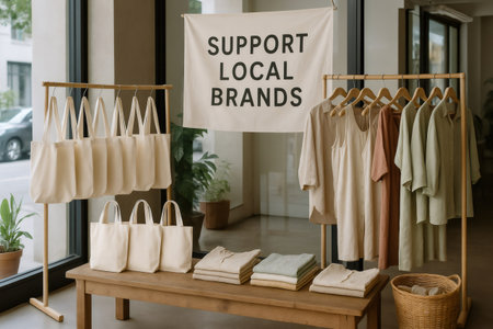 Sustainable fashion and tote bags displayed in a shop window, promoting local brands and eco conscious consumerism