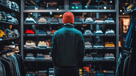 A stylish individual browses through a trendy luxury fashion showroom filled with upscale clothing, exploring various options for contemporary apparel and unique styles.
