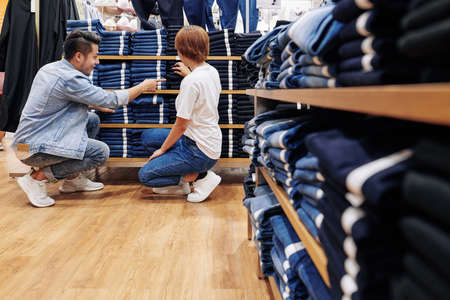 Asian man and woman choosing classic jeans in modern clothing store, horizontal shot
