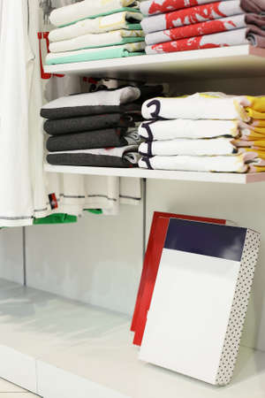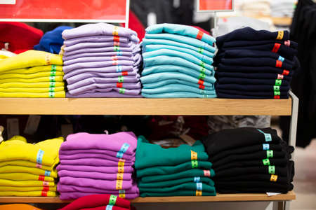 Custom apparel, clothes neatly arranged or folded on shelves. Stack of colorful clothing and baseball caps in the store. Horizontal shot