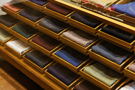 Close up view on colorful hanging and folded fabric textures and textiles in high resolution found on a fabrics market