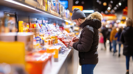 Young beautiful person deciding on groceries choosing food in convenience store organic meal healthy eating habits supermarket market customer looking for a lunch