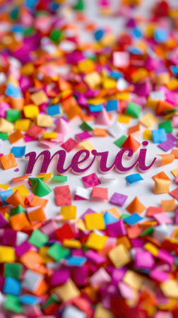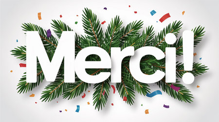White Merci text on fir branches with colorful confetti on white background. Clear details and vibrant color...