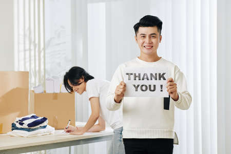 Portrait of happy smiling young Asian volunteer center worker showing sheet with thank young inscription